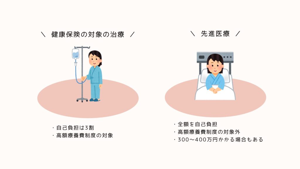 その健康保険の対象になっている通常の治療であれば、自己負担は30%だけで済みますし、高額療養費制度も使えるので、かなり自己負担額を抑えることができます。