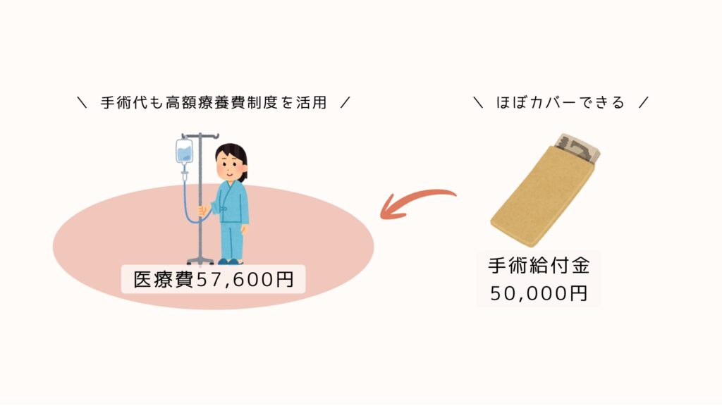 入院給付金5,000円の10倍、つまり5万円の手術給付金がもらえれば十分カバーできそうですね。