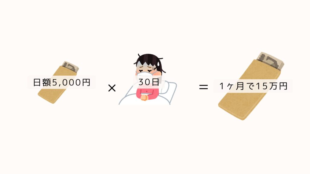 日額5,000円がもらえるプランなら、1ヶ月に15万円貰える計算になります。