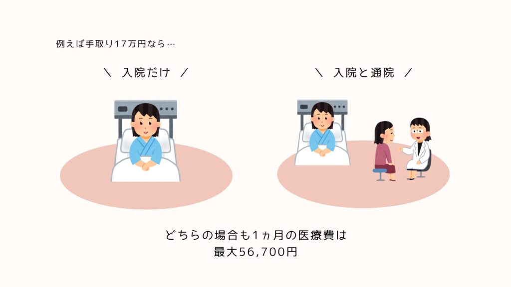 入院後の通院についても高額療養費制度の対象になるので、1ヶ月に「入院+通院」をしても医療費が上限を超えることはありません。